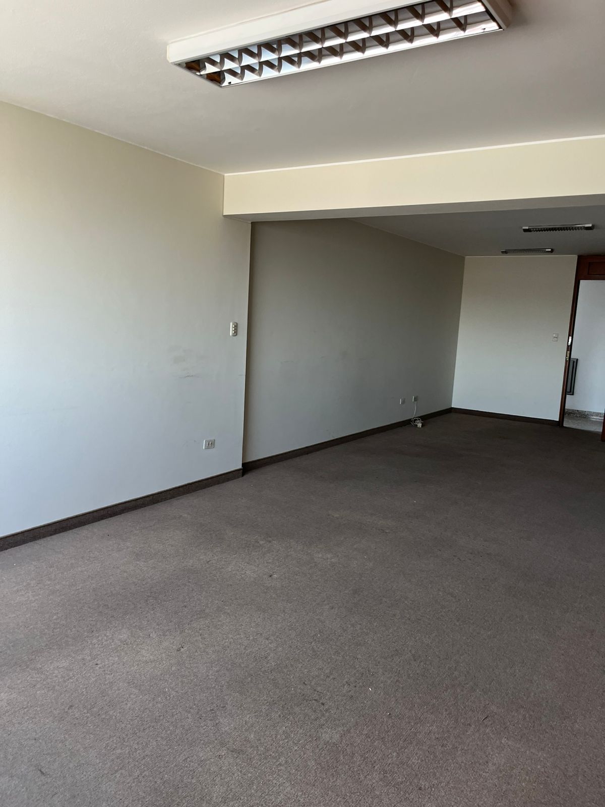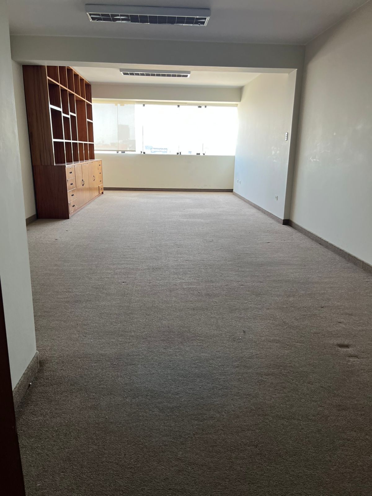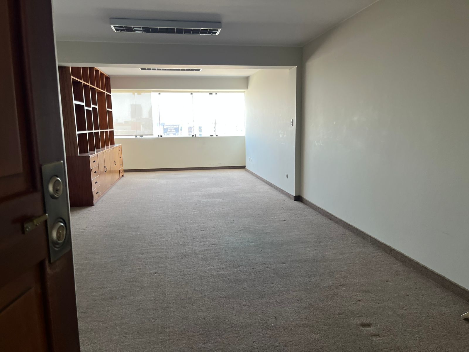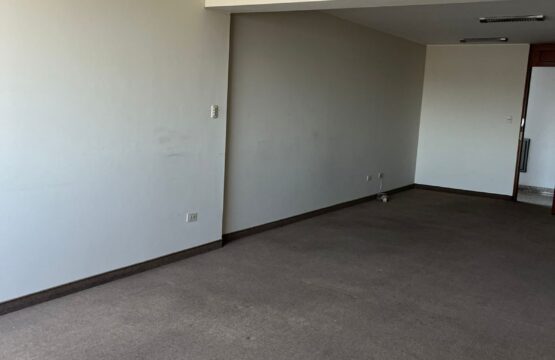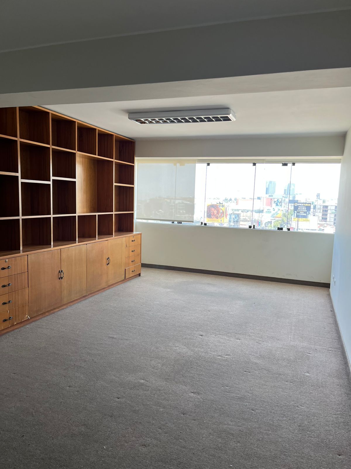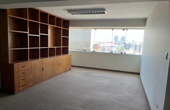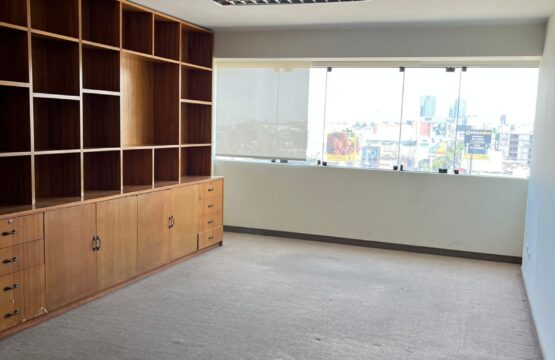 Oficina rectangular de 39 m² y un medio baño con vista a la ciudad.