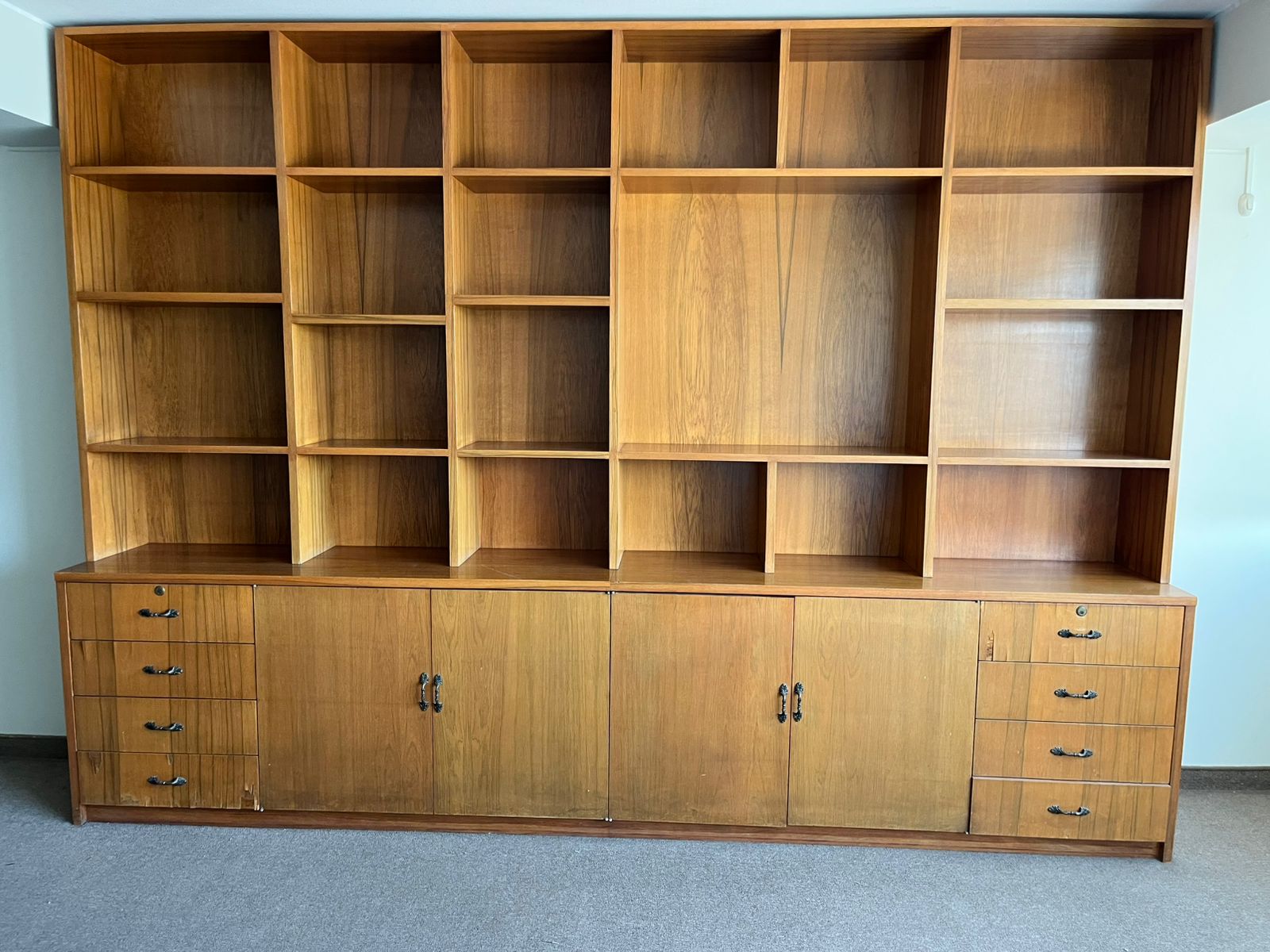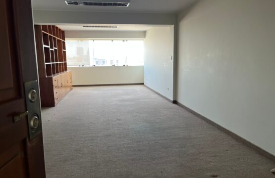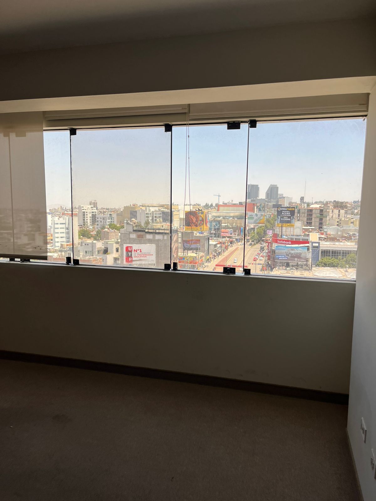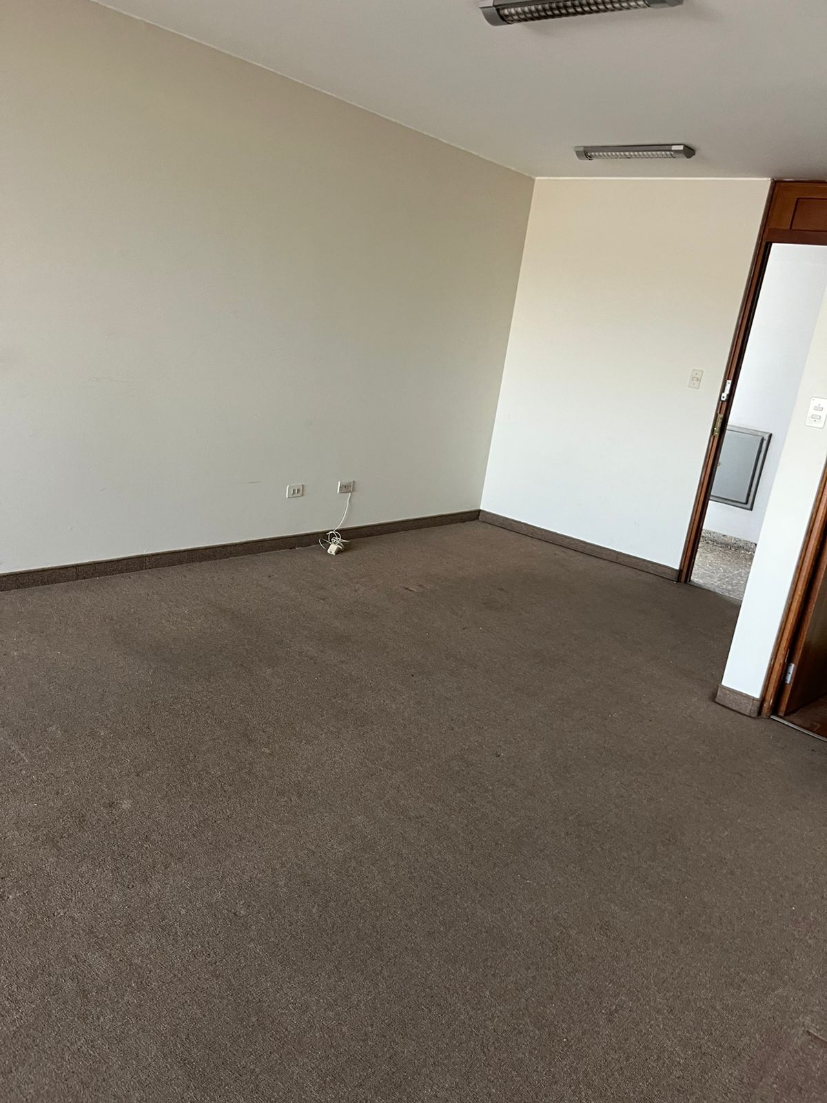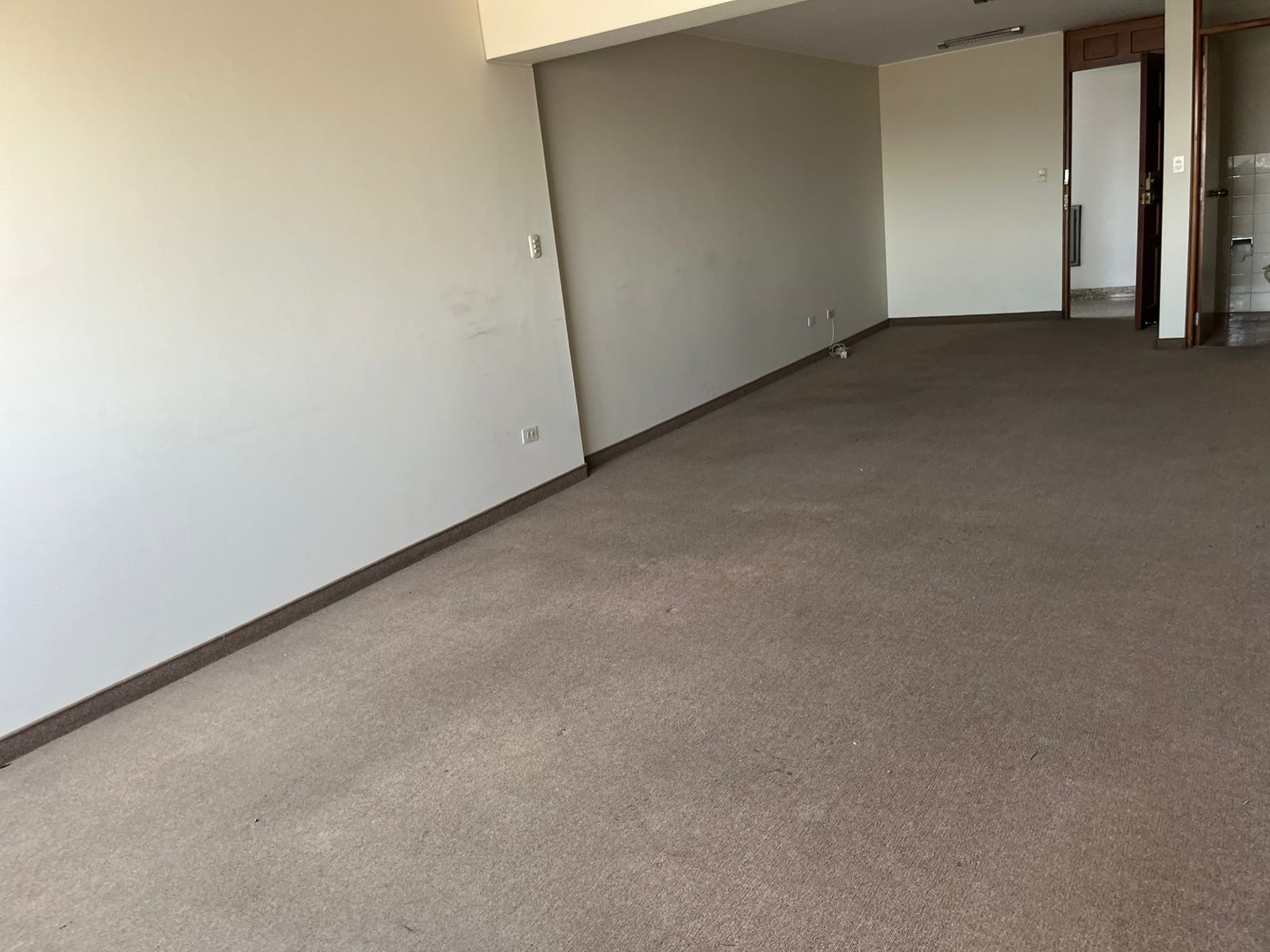 Oficina rectangular de 39 m² y un medio baño con vista a la ciudad.